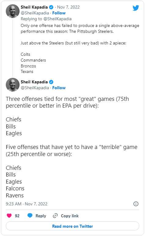 Posted November 12, 20222 yr A Very Good Offense Posted: November 9th, 2022 | Author: Tommy Lawlor The Eagles are second in the NFL in scoring and third in yards. This is a really good offense that can beat you in a variety of ways. They are Top 10 in both running and passing. They have a variety of playmakers. They also have arguably the best OL in football. Having a good offense is critical to winning the Super Bowl. The last six SB winners all scored 30 or more points in at least two playoff games. The Eagles have been consistent on offense, scoring at least 20 points in every game. They have 24 or more in all games except the win over the Cardinals. Interestingly though, they have only scored 30 or more points twice. They put up 38 on the Lions in the opener and 35 on the Steelers in Week 8. A missed FG kept them from that threshold last week. Bad weather might have been the key in the Jacksonville game. Still, it will be interesting to see if this team can start to score more. The biggest issue to date has been the lack of second half scoring. The Eagles put up 14 and 15 points in the second half of the last two games so maybe that problem is going away. This may seem like an odd thing to bring up. Now that we’re half-way through the season, I’m peaking ahead, and behind. The Eagles look like a legit Super Bowl contender so I started looking at past winners to see if there are any trends and how this team matches up. Being able to put up big points in the postseason is one thing that stood out to me. Why so important? I think there are two reasons. First, you want to be able to put the game away if possible. Think back to the NFC Championship game with the Vikings. The Eagles scored a TD with 1:09 left in the first half to go up 21-7. The Vikings punted back to the Eagles with :29 left. The Eagles were aggressive and added another FG to lead 24-7 at halftime. The Eagles got the ball to open the second half and scored a TD to go up 31-7. Game over. Those 10 points broke the will of the Vikings. Case Keenum wasn’t going to lead an epic comeback at The Linc against those Eagles. If the score was only 21-7, the Vikings might have made some type of a comeback. I don’t think they were winning regardless, but the points ended any hope they had. The other key reason points are so critical is that you tend to face realy good QBs in the postseason. In SB LII, the Eagles led 15-3 in the mid-second quarter and then 22-12 at halftime. They were up 29-19 in the mid-third quarter. Tom Brady ain’t Case Keenum. The Pats kept firing and eventually took a 33-32 lead. The Eagles added a TD and FG to win by a final score of 41-33. There are still some defensive battles in the postseason. Those Eagles beat the Falcons 15-10 in the Divisonal Round. Those games aren’t common anymore. Last postseason, only two games were won with fewer than 20 points. There were three games where the losing team scored 24 or more points. ***** One of the things I love about the Eagles offense is how it affects defenders. They don’t know who to key on. They don’t know where the ball is going. They don’t know what’s fake and what’s real. [NOTE: click on link to article below to view videos] This offense is so versatile that it puts tremendous stress on the defense. I’ve seen defenders get upset before. Sometimes they’re frustrated at how talented an offense is. I’ve seen them frustrated with handling unique talents. How do you defend Randall Cunningham or Michael Vick? How do you cover DeSean Jackson? We see defenders confused this year. They just aren’t sure what they’re dealing with. I remember seeing that when the Wildcat hit in 2008, but that got solved pretty quick. This is different. Teams have plenty of tape on the Eagles and still aren’t sure how to stop them. This isn’t just about X’s and O’s. The Eagles have the right guys to execute. In a way, Jalen Hurts and Dallas Goedert are the keys. Hurts can run or throw. Last year he was a runner who could sometimes throw. He’s worlds better this season. And Goedert is tough because he’s very good as a blocker and receiver. If you want to run, he gives you six good blockers. That’s tough on a defense. If he goes out on a pass play, he can beat you short or downfield and he’s most dangerous with the ball in his hands. Versatility is good, but having players who can execute both run and pass at a high level is a whole other story. That’s what helps make the offense so tough to stop. There might be a play where the defense does know what’s coming and still can’t stop it. Here are some videos that show you just how challenging the offense is. [NOTE: click on link to article below to view videos] If you like numbers and metrics… http://igglesblitz.com/2022/11/a-very-good-offense/