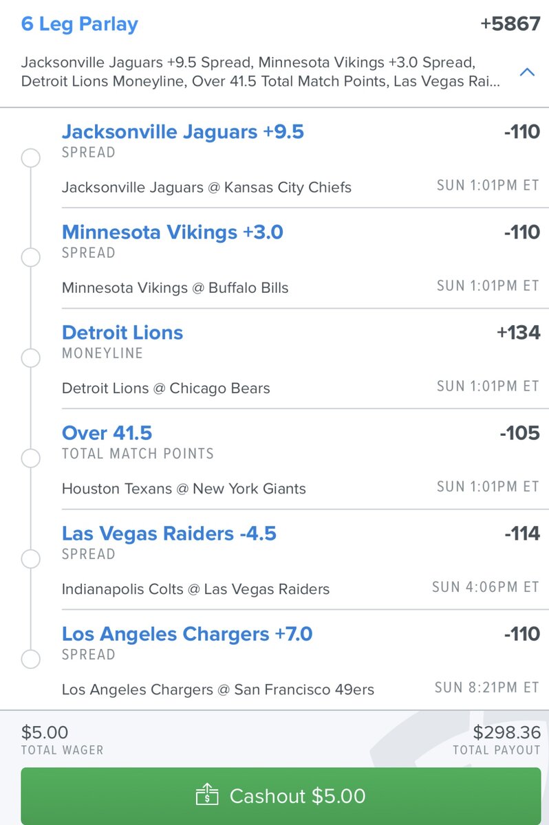 September 1, 20232 yr I usually do one $5 parlay for the early games and one $5 parlay for the late games. And then always drop a $1 on a full day parlay every week too. Week 1 will pay be $28,000 if I win the 16 game parlay 😂