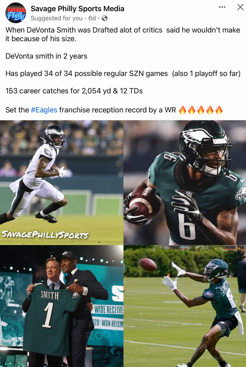 January 14, 20233 yr 2 minutes ago, EagleVA said: Good post!! I will take exception to the good route runner makes one NFL ready. When the Eagles draft Smith I expected a Stefon Diggs type of receiver, but they're very different. Diggs is more of a quick WR that gets open by running fast routes coupled with his quickness. Smith is a more of a long strider type of WR that has average at best long speed, while he has good hands and a great vertical, his routes are interrupted by the slightest contact, so bump and run renders him ineffective due to the lack long speed. Being a good route runner with average speed makes for an average WR against #1 corners. In most cases (and historically) I would agree with a lot of this. If you were to have told me 4 years ago that a guy with Smith's size/skillset, etc would be a true #1 receiver in the NFL, I would have said, "not a chance". That said, DeVonte Smith breaks the mold. And I say that with nearly 35 years of experience, specifically focusing on WR's and QB's. I know you watch the games and I'm sure you've paid attention to DeVonta Smith on the field. Sometimes (myself included), when watching a specific player, some will only "see" what they "want to see" in order to "justify" their opinion on a player. DeVonta Smith thrives in man on man, press coverage. In most cases, he beats his press by running a precise route (designed) to beat press coverage. He does it with such skill and precision, that teams no longer tend to press him nearly as much as they tried last year and even earlier this year. I've never seen a guy of his size beat man on man as well as he does - and he does it on a regular basis. As far as "disrupting his routes" - does it happen on occasion? Sure it does - it happens with every WR in the NFL, in every game. But the vast majority of the time, he isn't disrupted and runs clean, precise routes that tend to get him open - A LOT. If you watch him closely, even when a defender "thinks" he's disrupting his route, he's so "slippery" that he tends to glide by them - sometimes sideways, and gets right back on his specific route path. It's both uncanny and amazing the way he does it. I've never seen another player quite like him, especially given his size/weight, etc - not in the last 35 years.