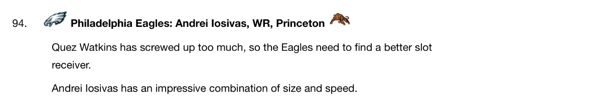 February 16, 20232 yr 16 hours ago, Ace Nova said: Yep. Watkins himself took accountability after the game and basically said that he had "regressed" this past season. That alone could bode well for his future development. That said, it's also the coaching staff's responsibility to put players in positions to succeed. Watkins isn't a "slot receiver". He's not a guy you want going up the middle, making contested catches. That's not his strength. I'm hoping they design better plays for him - many of which he had plenty of success in college - deeper slants, outs, etc. Those are the types of plays I envision him to be better at. Once he gets into a rhythm and his confidence level increases, then maybe start developing his shorter, inside game. But let the guy be successful at his strengths first. For example, look at the deep curl he runs here at 1:10. And then the intermediate "stop and go" route at 2:40: Those are the type of plays we should be feeding him, imo. At this point I’m not really sure what Watkins strength is as a receiver. He’s poor on stop start screens, because he lacks elusiveness and the ability to make defenders miss which is why he’s also a terrible return man. He doesn’t like contact so short to intermediate slot routes he’s likely to stop his route to avoid a hit or give up the ball on a contested catch. He’s not good on the outside either, because on a simple curl route against the last regular season game against the Giants, Hurts threw him the ball and he just stopped moving. The defender came in and broke the play up and almost intercepted the pass. Had Watkins kept moving it’s an easy catch, but he lacks basic fundamentals. This is also baffling considering the HC has made it abundantly clear that wide receivers are his specialty. Why has Watkins regressed to this point of a player who basically has no position? I don’t get it either, but it’s pretty obvious the Eagles also saw that Watkins had regressed as Pascal seemed to play a lot more in the end of the season than he was earlier.