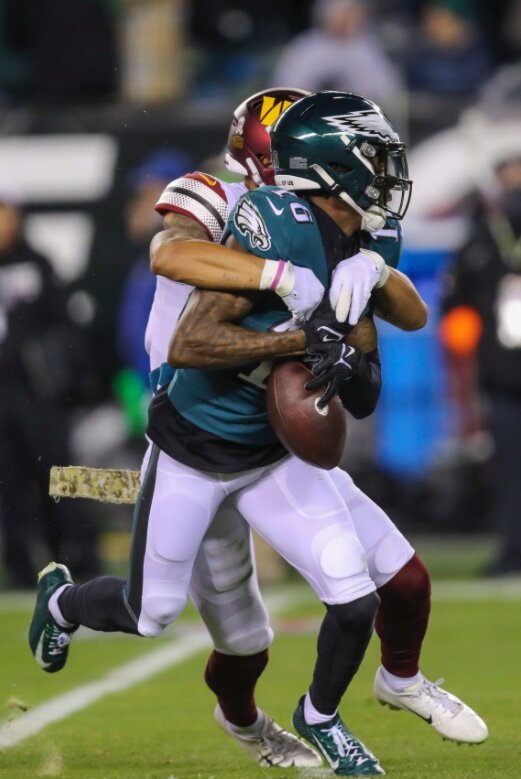 November 12, 20232 yr 20 hours ago, EagleVA said: This is my issue with the conclusions of most on Quez, other than those silly bubble screens, how often do they throw to him underneath? Pretty much never so how do you say he struggles underneath? Moreover, other than the silly bubble screens, how often is he targeted at all? If you say he isn't thrown to because Hurts has no trust in him, did Hurts not trust Goedert early in the season and has he not trusted Smith as of late, he surely hasn't been targeted much. The lack of spreading the ball around is going to burn the Eagles if it continues, count on it! The problem with throwing to your boy underneath is nothing good generally comes from it. Quez is scared of contact. When he gets hit bad things like this photo happens or he stops running his route against the Giants which led to a Hurts interception. Or he gets the ball ripped out his hands TWICE against the Cowboys which led to two interceptions for Minshew. Hurts has every right not to trust him, because when defenders are around him he folds up. He’s best when he’s all alone. Like I’ve already mentioned before that touchdown Hurts threw to Jones in the end zone he never would have thrown to Watkins, because Watkins is scared of contact. You can’t be a good football players if you are scared of contact. Where are you getting this idea that the Eagles aren’t spreading the ball around though? They have thrown the ball to WRs, TEs, and even the backs this year far more than they have any other time with Hurts as the quarterback. Not sure what your claim is based on. Eleven different players have caught a pass from Hurts this year.