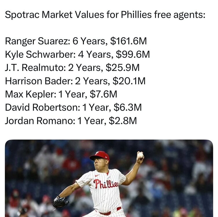 Would also have Castellanos gone (half as i think he’s tradeable if you eat half the salary and not take anything back), ranger’s arbitration is off ($8.8), Romano is off, Ross is off and Kepler is off ($24 mil). I also don’t think alavardo is coming back at $9 mil. Probably less than what he got this year due to suspension and injury. If you deal Bohm also his arbitration which was $7.7 mil. So with Castellanos at half that’s about $50.5 mil off their 307 mil payroll in 2025 (if you get schwarber at 4 years $120/5 for $150mil and jt somewhere between 12-15 mil per). I think they are probably willing to go higher to 325-330.