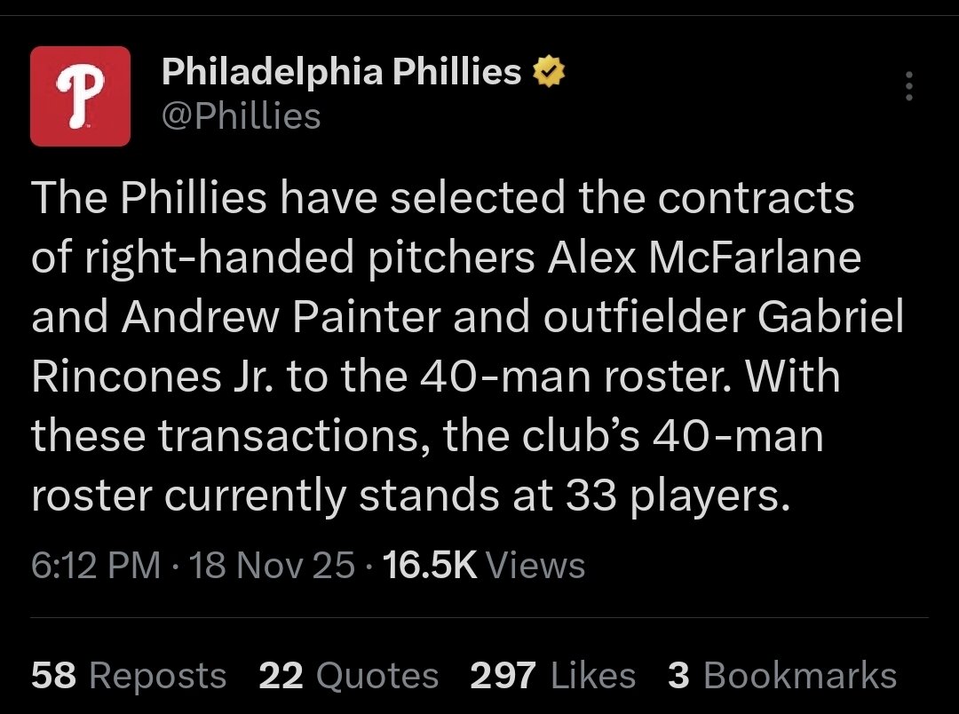 November 19, 2025Nov 19 Passan says Tucker makes sense if schwarber leaves https://x.com/sleeperphillies/status/1990821049030648149?s=46