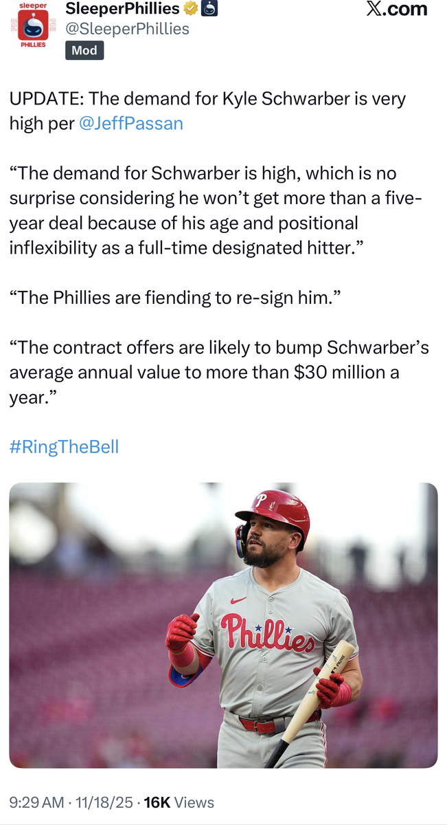 November 19, 2025Nov 19 1 hour ago, e-a-g-l-e-s eagles! said:Passan says Tucker makes sense if schwarber leaveshttps://x.com/sleeperphillies/status/1990821049030648149?s=46Makes more sense to go after him over schwarber and I love schwarber