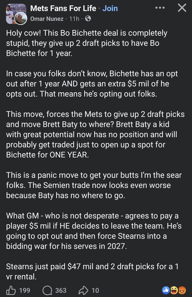 January 17Jan 17 7 minutes ago, vsptroops said:Hey, at least they are going to host the all-star game this year. Granted, they'll be 15 games back by then but maybe Schwarbs can win the homerun derby as a consolation prize for the fanbase. What a gd joke DD is and shame on Middleton for allowing his incompetence to continue to destroy his team.People can disagree with me on this, but the reason why I felt like Bichette might not come here last night was they had four days to get a deal done. Just had a hunch someone was going to step in and give him a competitive offer. They have a zoom on Monday then three other days before Tucker signed. If they badly wanted him as much as the national media was making it out to be then I think they would’ve went out of their way to make sure it got done and locked it up. They did not. all the sudden they wanted too and offered him what he "wanted all along”. I have a feeling that contract they offer him wasn’t exactly all he wanted. Feels like a Phillies leak and Bichette camp doesn’t care to respond cause it doesn’t matter at the end of the day. Obviously he wanted to opt out. But I have a feeling he wanted something closer to 225 to 250. the Phillies thought will nobody else is gonna give them this long of a contract with that type of so we don’t have to worry about that. So he will take it. they got screwed because the Mets got shafted with Tucker and just said F it.