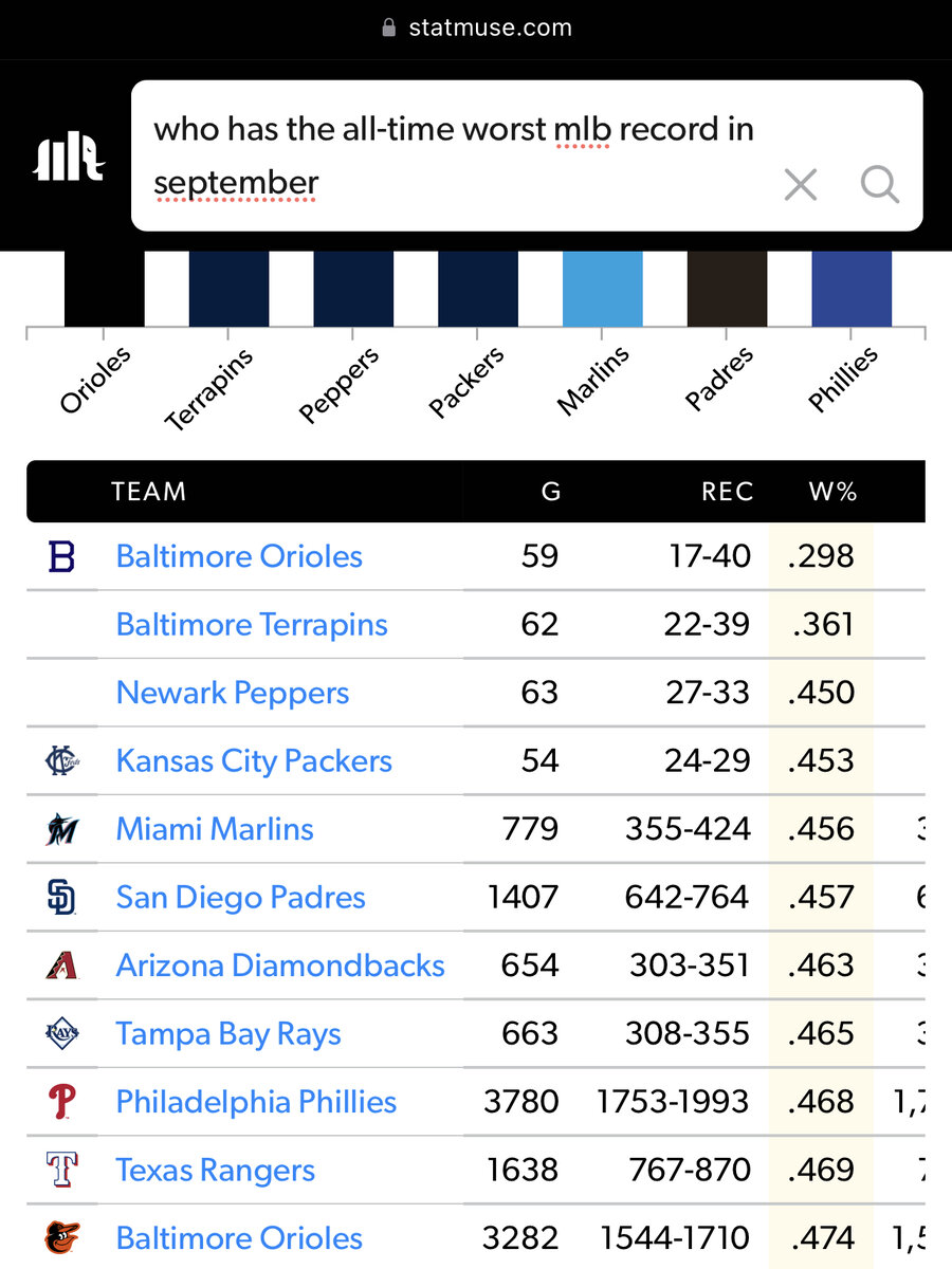 October 1, 20223 yr 2 hours ago, JohnB said: Let's face it. The Phillies are perennial cellar dwellers. Every now and then we get lucky. And then there's seasons like this one where they jerk us around, have us thinking big, until September rolls around. Phillies must be the worst team in September in the history of baseball. They do have the most losses of any baseball franchise and sports franchise. We are top 5 according to statmuse of teams that still exist
