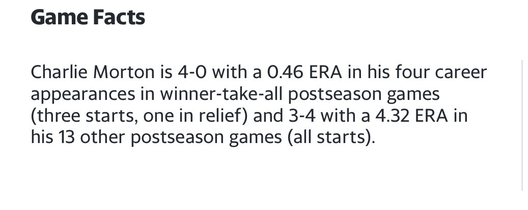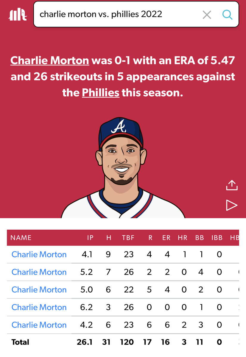 October 15, 20223 yr 9 minutes ago, toughfighter83 said: that's assuming that hitters dont pull a game 2 They aren’t facing Kyle wright in game 4 who is one of the best pitchers in the NL whose era was sub 3 and was 21-5. There’s a massive difference between Morton and wright. The one game he was really good was at home
