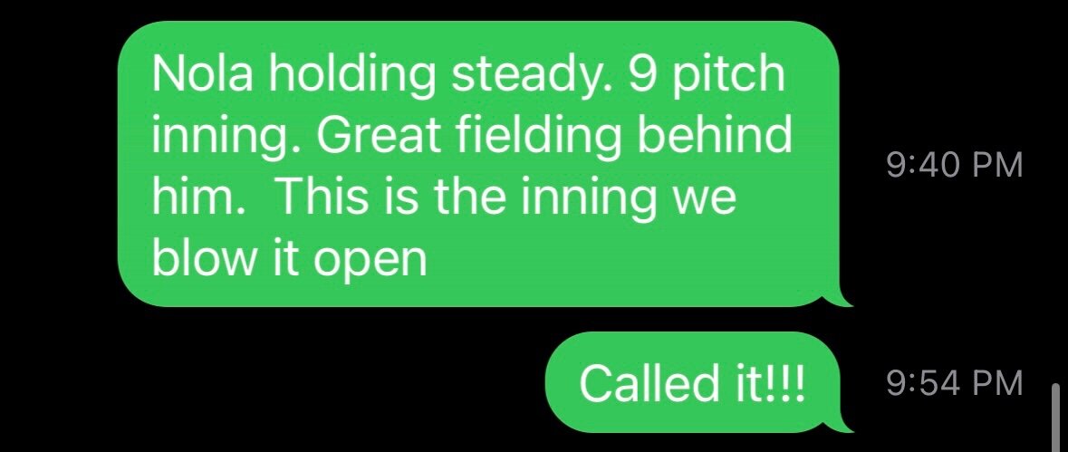 October 5, 20232 yr I totally called the big inning with the slam. Removing personal data but here’s my text mid 6th.