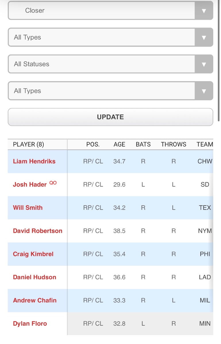 November 9, 20232 yr 4 hours ago, Steve 17 said: Nah, the need isnt in the outfield...... they need a frontline sp and a true closer. Plus you need to find the C of the very soon future..... Marchan keeps getting injured. There’s one good closer on the market. It’s hader. I’d bet a lot of money they aren’t going to spend the money and years it costs to get him here. You’d need to trade for one and I’m guessing they aren’t willing to do that with Alvarado, dominguez, soto, Hoffman and Orion back next year. Also have McGarry might become a back end of the bullpen guy. has been talks about it. I have a feeling his best role might be a late inning guy here’s your FA closers list