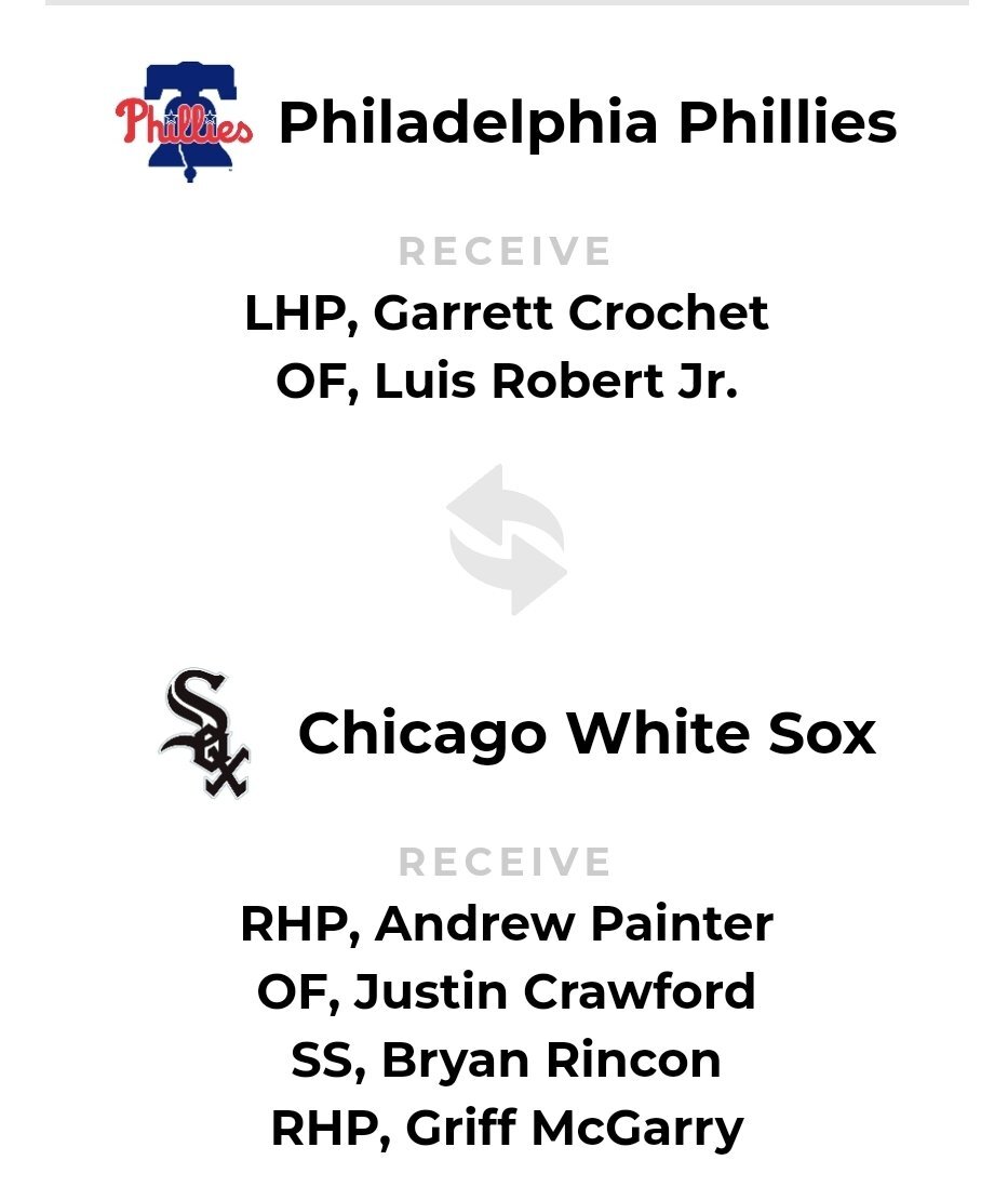 July 5, 20241 yr 6 minutes ago, iladelphxx said: You guys are missing the point... Crochet is a legit top of the rotation starter. He'd probably be our #2 Starter Frankly I’m not sure why the white Sox include him in that deal. They were asking for a Soto like return for Robert. So makes little sense to include both of those guys for that package especially when crochet has 2 years of arbitration left. That said I don’t really want Robert. I think the asking price is way too high. I think there’s going to be decent outfielders that fit better into this team and you’re not gonna have to give up the prospects you are for a guy who’s not exactly durable.