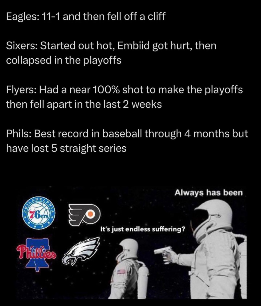 July 31, 20241 yr It's incredible watching a team in first place just give up - somehow both the Eagles and Phillies managed to do it in their same respective seasons.
