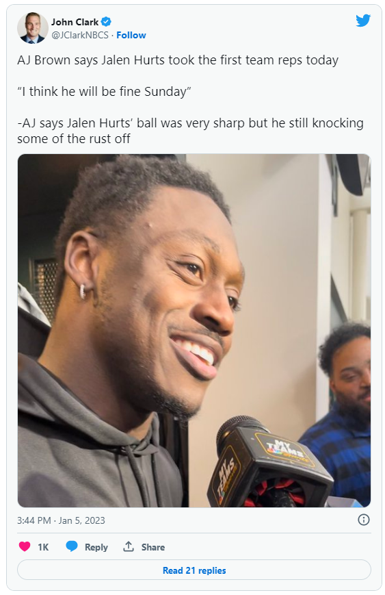 Posted January 6, 20232 yr Hurts a limited participant again but trending up Eagles quarterback Jalen Hurts was a limited participant again on Thursday but is trending in the right direction as the Eagles’ regular season finale against the Giants looms on Sunday. Hurts, 24, began the week as a limited participant on Wednesday and had the same status on Thursday. But Eagles receiver A.J. Brown confirmed that Hurts took first-team reps on Thursday. "We’re all excited. We’re all excited to see him back, doing his thing,” Brown said. "He’s locked in for sure. He definitely had a tempo about him today, even in the walkthrough. He was telling guys to ‘come on, hurry up, get going.’ Glad he’s back.” Hurts has still not been a full participant in practice since suffering a sprain to his right (throwing) shoulder against the Bears on Dec. 18. Not only was Hurts up first among quarterbacks in throwing drills on Thursday, but he also participated in the ball security drill. At the Thursday practice last week, Hurts was held out of this drill. Hurts has missed the last two games with that shoulder injury and the Eagles have dropped both of them — to the Cowboys and to the Saints — with Gardner Minshew starting at quarterback. Before the injury, Hurts was putting together an MVP case. In 14 games, Hurts completed 67.3% of his passes for 3,472 yards with 22 touchdowns and 5 interceptions. He also rushed for 747 yards and 13 more touchdowns. Any talk of his being a system quarterback has evaporated over the last couple weeks. His absence has been extremely visible. If Hurts does return to action on Sunday, expect the Eagles’ coaching staff to alter their game plans with his injury in mind. We’ll probably see fewer designed runs and fewer read-options in an attempt to limit his exposure to big hits. Here’s the Eagles’ full injury report from Thursday: Did not participate: Lane Johnson (groin), Josh Sweat (neck), Avonte Maddox (toe) Limited: Jalen Hurts (right shoulder), Miles Sanders (knee), Shaun Bradley (wrist), Janarius Robinson (ankle), James Bradberry (rest), A.J. Brown (rest), Fletcher Cox (rest), Landon Dickerson (rest), Brandon Graham (rest), Jason Kelce (rest), Isaac Seumalo (rest), Darius Slay (rest) Full: Zech McPhearson (illness) Johnson and Maddox both suffered injuries a couple weeks ago and will definitely miss Sunday’s game. And Sweat has now missed the first two practices of this week as he gets over a scary neck injury against the Saints. Sweat has said he will return this season but the Eagles will show precaution. Cornerback Zech McPhearson returned on Thursday after missing Wednesday with an illness. While they’re not on the injury report because they’re still technically on IR, S C.J. Gardner Johnson (lacerated kidney), DE Robert Quinn (knee) and OL Brett Toth (knee) all practiced for the first time on Thursday. There’s a chance Gardner-Johnson and Quinn could return for Week 18 but the team will see how they get through the rest of the week. https://www.nbcsports.com/philadelphia/eagles/eagles-injury-update-jalen-hurts-limited-trending