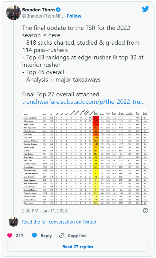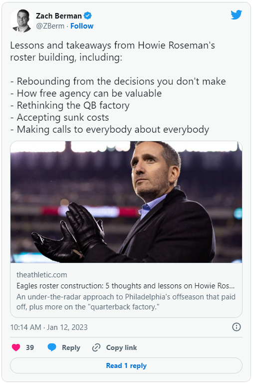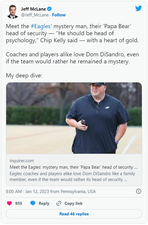 Posted January 14, 20232 yr Lots of Help Posted: January 12th, 2023 | Author: Tommy Lawlor Jalen might be the league MVP. Nick Sirianni is in the running for coach of the year. Those guys get the bulk of the attention, but a lot of people had a hand in the Eagles success this season. Reddick turned out to be a great signing. I thought he was a good addition who would help the defense, but I didn’t see him racking up 16 sacks and 5 FFs. He has a legit shot at Defensive Player of the Year. Reddick is an impact rusher, but also a good run defender. Beyond the plays he’s makes, Reddick creates sacks for his teammates. He gets into the backfield and the QB has to move. The Eagles didn’t have 70 sacks by accident. Brandon Thorn charts sacks so he can grade pass rushers accurately. He factors in quality as well as quantity. His top rated pass rusher? Haason Reddick. Josh Sweat was 7th and Brandon Graham 9th. That’s incredibly impressive. Let’s give some credit to a coach. Washburn coached the edge rushers for the first time ever and I don’t think their success is a coincidence. Washburn wasn’t splitting time with teaching Fletcher Cox and Reddick the same stuff. He focused on the edge guys and what they needed to do to succeed. Winning on the edge is very different from winning inside. Kudos to Washburn and his pupils. ***** Jeff McLane wrote a great piece about the Eagles head of security, Big Dom. Make sure you read that. Also a reminder of the value in subscribing to local papers. Support them so we can get good stories like this. Big Dom is part of the Eagles success. He helps with a lot of different things behind the scenes. You don’t win games without someone like him who can connect with people as individuals and not necessarily coaches or players or whatever their role is. It also helps that he can keep some players out of trouble and can help players navigate situations when they do get in trouble. Very good story. ***** Let’s go back to the coaches side of things. Gannon and Steichen have done an outstanding job of running the offense and defense this year. They deserve to be looked at for head coaching jobs. People get mad at Gannon for not being aggressive enough or Steichen for throwing too much, but each guy can point to terrific results this year. I think you also have to give credit for Sirianni for hiring them and developing them as leaders. He lets Gannon run the defense and Steichen has been calling plays since the middle of last season. Some head coaches micro-manage. Sirianni empowered his guys and they have rewarded him with great performances. ***** The key to success is having good players. Somebody has to go get those players. Good piece from Zach. Another reason to subscribe. We’ve all given Howie a hard time for his bad moves and outright failures. He deserves a ton of credit for the moves he has made the last two years, putting the Eagles into position to win a Super Bowl. The real challenge Howie has had is keeping a team at the top. It will be interesting to see how he does this coming offseason. He will have some tough decisions to make on who to keep and who to let go. http://igglesblitz.com/2023/01/lots-of-help/