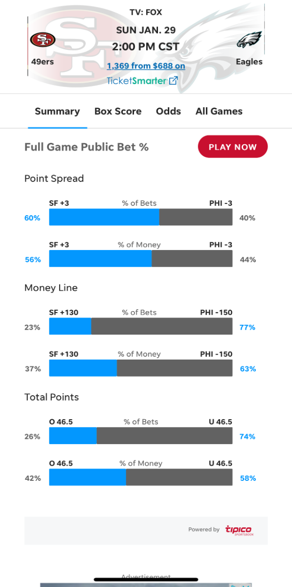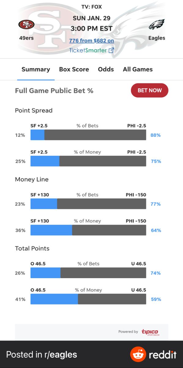 January 28, 20232 yr Author 11 minutes ago, Thrive said: Interesting, so at -3, we do get closer to 50/50. Curious to see what happens in the AM. Would think things settle at -3. That's why the hook matters, but do does the vig. I use MGM for line data and as of today, they have the Eagles -3 even money. Yesterday, they had the Eagles -2.5 -115, which is a big difference. Conversely, they have San Francisco getting the 3 -120.