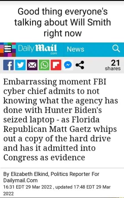 March 31, 20223 yr 28 minutes ago, toolg said: Wait, what? So Hunter Biden's supposed laptop with incriminating evidence that mysteriously appears in a random Delaware computer shop, gets shipped out, disappears for months... Now suddenly appears in Gaetz's possession and he wants to admit as evidence? No, that doesn't sound shady at all. If you copy the hard drive of a laptop without the owner's consent, you are a criminal.