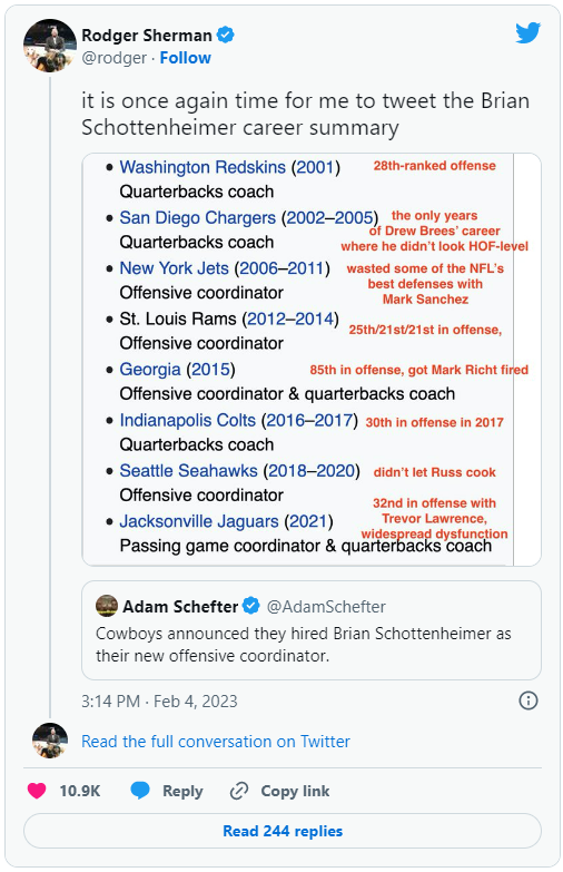 Posted February 5, 20232 yr Super Bowl Talk Posted: February 4th, 2023 | Author: Tommy Lawlor The big game is just over a week away. Something tells me this week will take forever to go by. The good news is that we’ll have plenty of time to talk about the game. Here are some random thoughts bouncing around my head. Coaching Advantage Most people are saying Andy Reid gives KC a coaching advantage. I totally get that argument. Reid is a Hall of Fame coach and he’ll be in his fourth Super Bowl (plus two as an assistant). Nick Sirianni will be in his first Super Bowl. Both guys are outstanding coaches. That said, Reid didn’t exactly shine in his previous Super Bowls. He lost to the Patriots in 2004 and I don’t think anyone would say that was a great performance by him or the Eagles. Reid lost in 2020 when the Bucs beat KC 31-9. The one time Reid did win, KC trailed the Niners 20-10 going into the fourth quarter. Patrick Mahomes came alive late and KC won 31-20. Reid is a great gameplanner and has a ton more Super Bowl experience than Sirianni. When it comes to gameday, we’ll see. Sirianni has been masterful at keeping his team focused. He’s had the right message for them all year long. The Eagles haven’t trailed in the postseason, dominating both games. KC might have the coaching advantage next Sunday, but I don’t think it is as clear cut as most are making it out to be. Up Front Last week I wrote that SF had a good OL and DL. The Eagles were simply better. Well, KC has a good OL and DL. The Eagles are simply better. I don’t know if that will be enough for the Eagles to win the game, but the formula has worked great this season. The OL is the foundation of the run game, which is one of the best in the league. The OL also does a great job in pass protection. Most lines have a specialty. The Eagles are freaks because they are so good in both areas. We got some great news on Jeff Stoutland. There is no salary cap when it comes to coaching. When you have a special coach like Stoutland, pay him big bucks. He’s given the Eagles good OLs for a decade now. He’s developed stars, starters and backups. Keeping him is critical to future success. Jason Kelce and Lane Johnson won’t be here forever. Stoutland will need to develop their successors. Cam Jurgens looks like he will be part of that solution. Stoutland is great because he can teach blocking, but also understands the X’s and O’s of the run game. His college background and time with Chip Kelly have to be important in that side of things. Do you ever get tired of watching OL/run game breakdowns? Special Team There are times when I don’t think any of us appreciates just how good the Eagles are this year. Wow. Those are some crazy numbers. This is a complete team. They can do everything well. Great running game. Outstanding passing attack. Best pass rush in the league. Best pass defense in the league. Solid run defense. There just isn’t a real hole. The run defense was leaky at times, but the addition of Linval Joseph and Ndamukong Suh has helped that. Even special teams ended up being a good unit. I can’t recall such a complete Eagles team. Normally there is one glaring weakness. Howie Roseman did a masterful job in putting the roster together and the coaches have done a great job at getting the most out of the players. Who’s underachieving? Maybe Quez Watkins, the #3 receiver. Special team. Cowboys Update No one cares too much about Dallas right now, but this is too good not to share. They hired Brian Schottenheimer to be their new OC. His resume leaves a little to be desired. Yikes. http://igglesblitz.com/2023/02/super-bowl-talk-3/