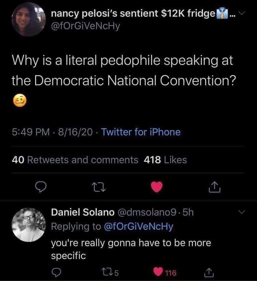August 23, 20205 yr 25 minutes ago, NOTW said: There's a pedophile that just announced he's speaking all 4 nights at the RNC.