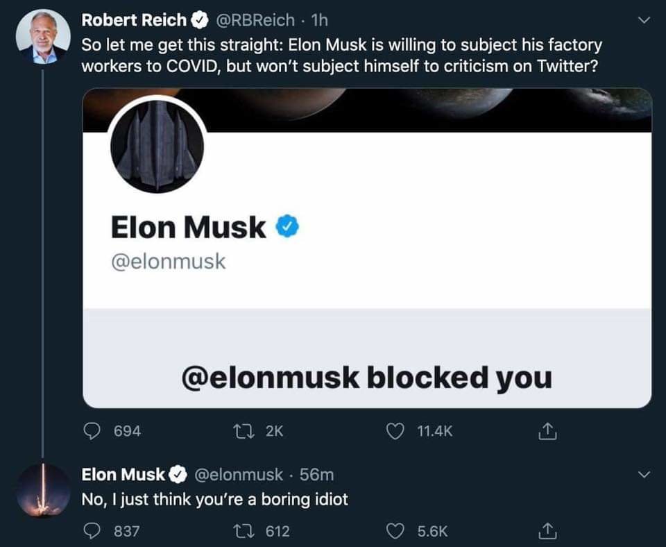 May 12, 20205 yr Honestly, Robert Reich and Elon Musk are perfect for each other. They're both convinced they're geniuses. LOL