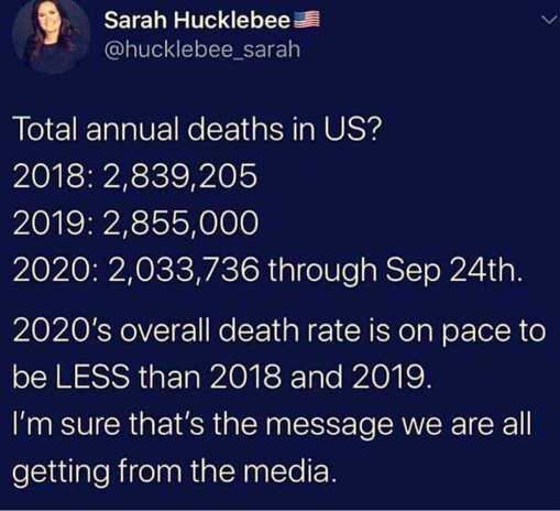 October 14, 20205 yr 1 minute ago, JohnSnowsHair said: That's just straight false. If you compare the previous years through week 38 (when this BS was posted) there were around 2.09 million deaths in 2019 and 2.32 million deaths in 2020. https://data.cdc.gov/NCHS/Weekly-Counts-of-Deaths-by-State-and-Select-Causes/muzy-jte6 Not to mention that there will be less deaths with people staying in most of the time (less auto accidents for example). It's a mind numbingly dumb statistic even if it were accurate.