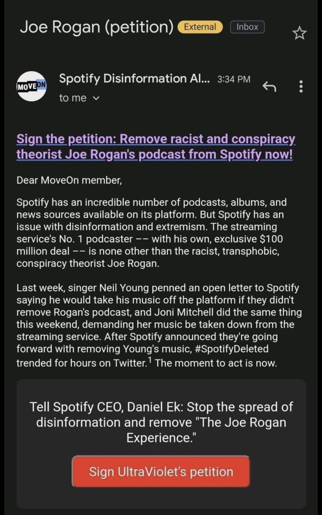 February 1, 20223 yr 13 minutes ago, Ipiggles said: He is trying to COERCE Spotify to Censor Joe Rogan. That was and still is his end game. You can twist it anyway you want, he is still trying to silence Joe Rogan. The left always wants to silence the opposition. They lable people they dislike with vile terms, like calling them racist etc rather than debate the issues..... They are not for free speech. And will not be on the right side of history. He is allowed to go to a company and say, "If you want to sell my stuff, then X." The company is allowed to say, "I won't sell your stuff." or they can agree. There is no censorship involved. Joe Rogan still has a podcast. Joe Rogan is still speaking and it is NOT the government silencing his speech. Nobody is silencing his speech. HE HAS NOT BEEN SILENCED BY THE GOVERNMENT. It really is very simple.