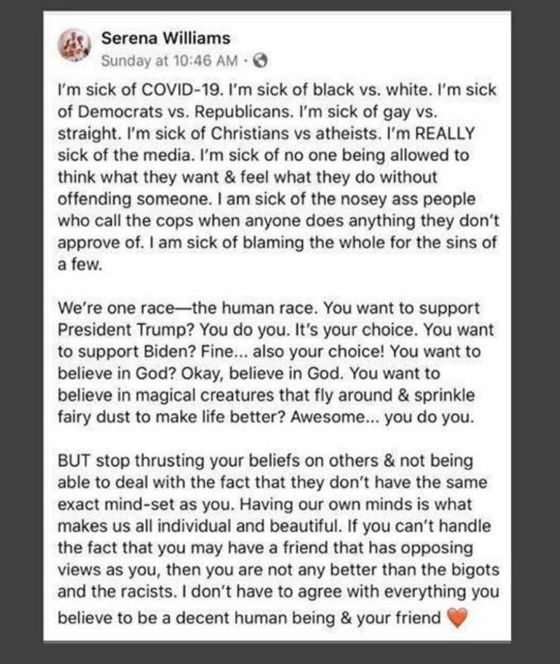 June 25, 20205 yr This one by Serena Williams is spot on with how I feel. Just in case you wanna be my e-friend. EDIT: Apparently Serena Williams did not author that post, according to Snopes. I apologize for that. However, whoever did write it captured my exact feelings.
