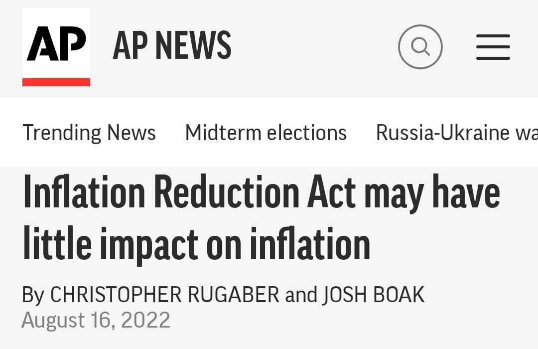 November 4, 20223 yr 1 hour ago, toolg said: CNBC: Inflation Reduction Act won’t curb inflation ‘over the short run,’ says economist CBS News: One thing the Inflation Reduction Act may not do: Lower inflation Philadelphia Inquirer: Inflation Reduction Act Won't Reduce Inflation Associated Press: Inflation Reduction Act may have little impact on inflation Wall Street Journal: The Inflation Reduction Act Won’t Reduce Inflation