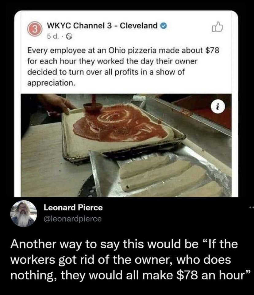 January 19, 20232 yr Author 10 hours ago, MidMoFo said: it was the owner who promoted employee appreciation day on Facebook to more than double their average number of orders. He turned over all SALES not all profits. They raked in $1,200 in tips for 220 pizzas, they usually do 90 pizzas. An amazing $5.45 in tips per pizza. If not for the owner promoting this and taking no profit and losing money because he gave up all revenue, the workers wouldn’t have got sheet. God bless that owner.