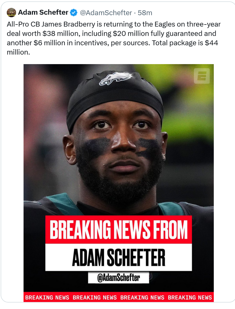 March 14, 20232 yr Just now, Procus said: Per Schefter, Bradberry coming back to Birds Howie is doing his master mind thing again if true.