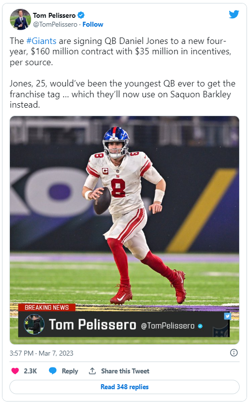 Posted March 8, 20232 yr How Daniel Jones' new 4-year, $160M deal with Giants impacts Eagles' QB Jalen Hurts The price for Eagles quarterback Jalen Hurts just went up again after the New York Giants agreed to t a four-year, $160 million deal with the Giants that includes $35 million in incentives as well. The $40 million a year puts Jones among the top ten highest-paid quarterbacks and he’s tied for 7th on the list with Dak Prescott and Matthew Stafford’s $40 million per season. All eyes will now turn toward new deals for Lamar Jackson (non-exclusive tag), Justin Herbert (Chargers), Joe Burrow (Bengals), and Hurts. Hurts is a Pro Bowl quarterback, All-Pro and 2022 MVP runner up. A 2020 second-round pick, Hurts won’t have to worry about a fifth-year option before he can cash out and 2023 will be the final year of his rookie contract. Howie Roseman is all about striking first and since the Eagles’ third-year quarterback’s trajectory has risen to elite status, Philadelphia could be on the hook for even more than was initially guaranteed when they signed Carson Wentz to a new deal. After leading the Eagles to the playoffs in back-to-back years, while also vastly improving under center, Hurts will soon be one of the top five highest-paid signal-callers. Here’s an early projection of what a new deal for Hurts would look like thanks to Jones. Eagles want to be fair Mandatory Credit: Brad Penner-USA TODAY Sports The Eagles have always been fair and early when it comes to projecting contract extensions and they must be prepared to now exceed the $40 million a year mark. Donovan McNabb’s 9-year, $70 million deal came prior to Howie Roseman joining the organization on a full-time basis. Roseman is a disciple of Joe Banner and learned his penchant for signing big-name players to team-friendly deals before the player hits free agency. The next big-named quarterback was Michael Vick, who received a 2-year, $6.8 million deal upon returning to the NFL in 2009. After McNabb was traded to Washington, Vick received the franchise tag ($16M) before Philadelphia then signed him to a six-year, $100 million contract with $40 million guaranteed. At that time, Vick’s per year base salary of $16.7 million was only less than then Patriots quarterback Tom Brady ($18.01) and Colts quarterback Peyton Manning ($18 million), but it was more than N.Y. Giants quarterback Eli Manning ($16.25 million) and Chargers quarterback Philip Rivers ($15.3 million). A few years after Vick moved on, Philadelphia acquired quarterback Sam Bradford from the Rams in 2015 and then signed him to a deal worth $36 million ($18M per) over two years, with $26 million guaranteed. https://theeagleswire.usatoday.com/lists/eagles-news-daniel-jones-jalen-hurts-nfl-free-agency/