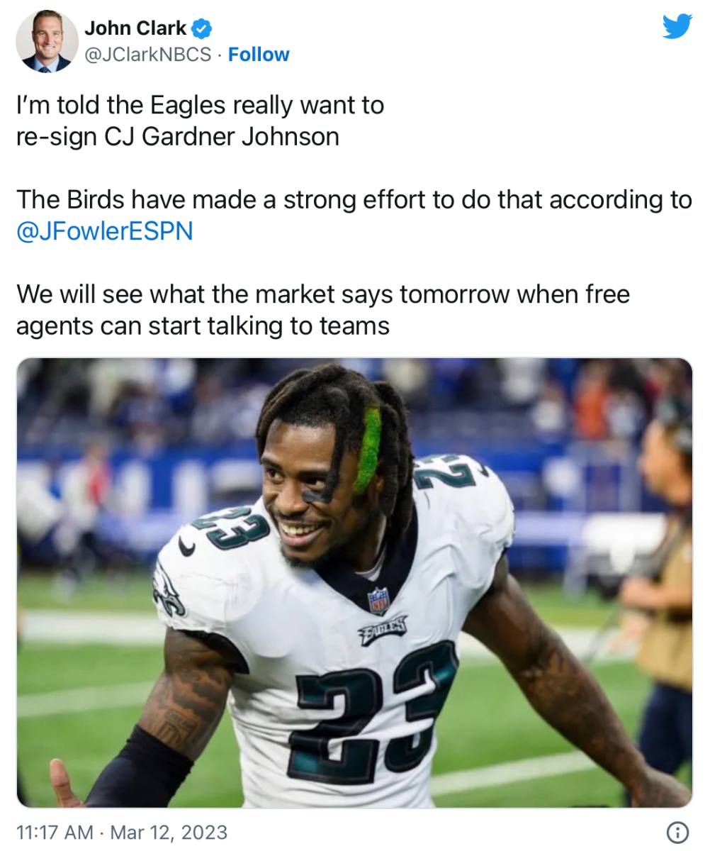 March 13, 20232 yr 13 hours ago, NOTW said: FWIW about Bradberry   I honestly think that means Slay is good as gone, because Bradberry is getting $17 to 20mill on the open market after last year and Howie must know that.