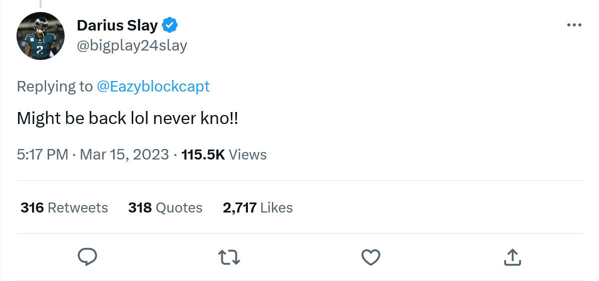 March 16, 20232 yr 29 minutes ago, ManchesterEagle said: I know it’s fashionable to think Slay sucks around here and quote the QB rating against in the second half of the season, but he is still a really good corner, often left on an island.. It’s great news he is back. We will still probably get a corner in the first or second, but we don’t have to reach and he can learn for a year behind Slay. I think some have said that. I think some of us just think he’s going to cost a lot to keep and perhaps cutting him is the better longer term option. That’s not because he sucks but the cap savings would allow us to do more with the roster. And if they were to draft a CB in the first round then medium term you would have them plus Bradberry.