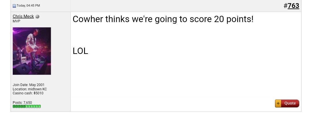 February 8, 20214 yr Chiefs Planet is melting down . Looking at how this game has played out, this pre-game post may be my favorite: You'd kill for 20 points right now LOL