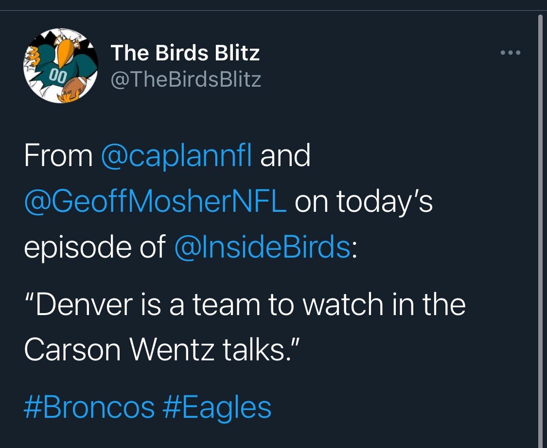 February 17, 20214 yr [Bowen] Spoke with NFL management source (not from Eagles) about the Wentz melodrama. His viewpoint: If Wentz doesn’t want the Bears, Bears aren’t gonna trade for him. Eventually the Eagles take whatever Indy is offering, maybe a second plus something. Also, Eagles draft a QB 6th overall