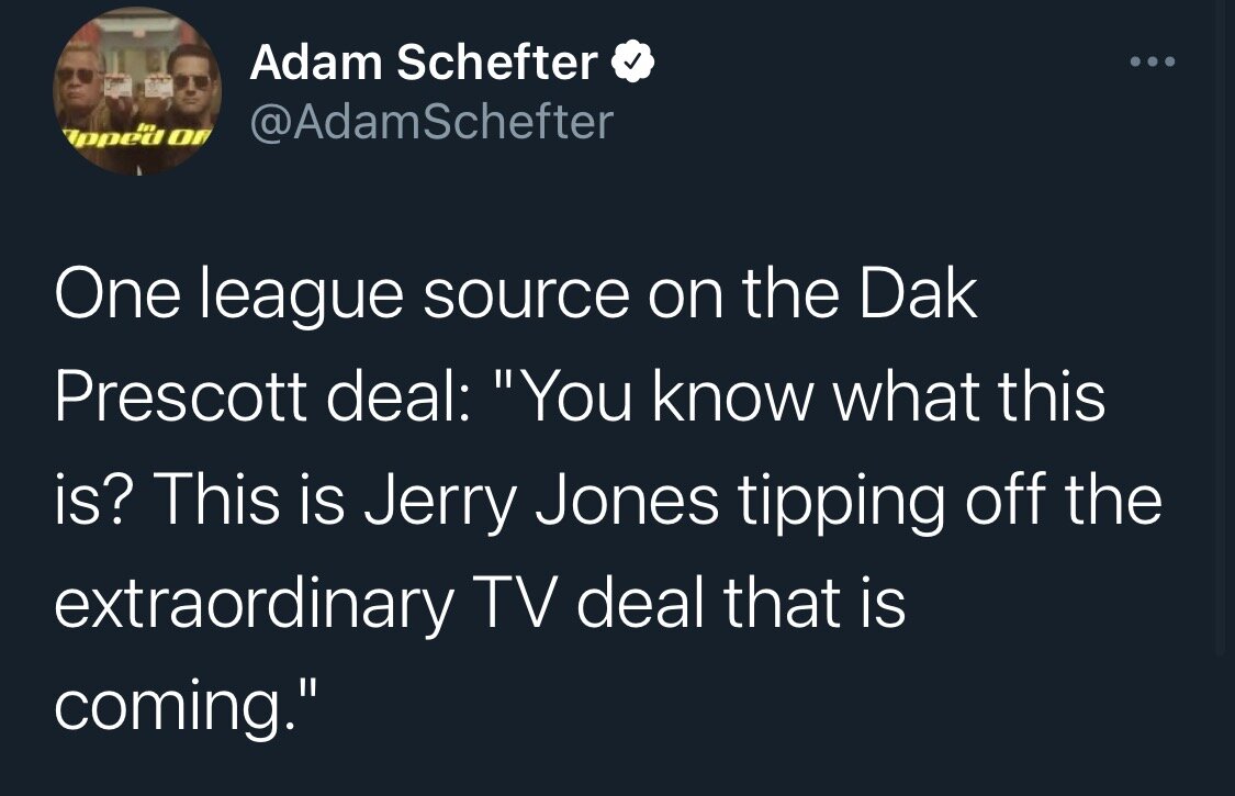 March 9, 20214 yr 1 hour ago, DaEagles4Life said: TV Deals end in 22 as well so Dax gonna get paid AGAIN. This is what is interesting..... It's a 4 year contract extension. And he was on the franchise tag last year. Therefore he would be under contract from 2021-2024 and an UDFA in 2025. Sporttrac does not have numbers yet. But they do have the following (empty) table Quote YEAR AGE BASE SALARY CAP HIT DEAD CAP YEARLY CASH 2021 28 - - - - 2022 29 - - - - 2023 30 - - - - 2024 31 - - - - 2025 32 - - - - 2026 33 - - - - 2025 34 UFA UDFA If I were to GUESS, I bet you Dallas did two things. 1) Give him an obscenely low base salary this year and next. The bulk of his base salary will be in 23 and 24 2) Pull a Howie and built in void years in 25 and 26, thus lowering his cap hit over the 4 years and taking a dead hit in 25. (Detailed bonus info isn't available from what I've seen, but the signing bonus was 66 million. So If they did that, the signing bonus would account for 11 million each of the 4 years and 22 in the voided year) If this is the case, this makes a TON of sense because his contract is modeled around the upcoming TV deal. Dak is happy because he gets paid. Dallas will be happy because his contract will be relative to the cap (and projected increase). Of course, this is speculation on my part, because we don't have any numbers and I'm just some idiot fan who obsesses over the cap making a wild guess. But if I am on track and it plays out that way..... and Dak stays healthy..... and COVID has little to no effect on the upcoming season..... This will end up looking like a reasonable contract.
