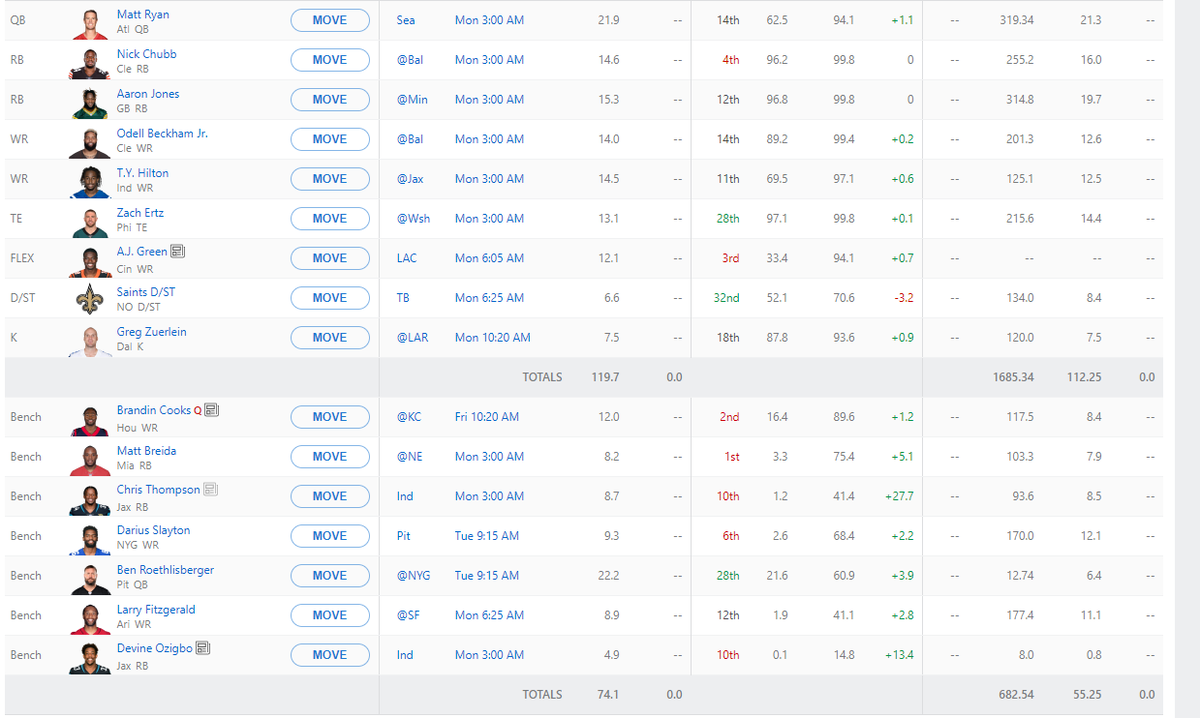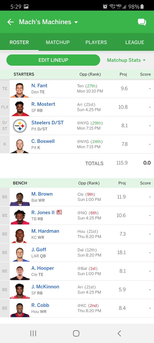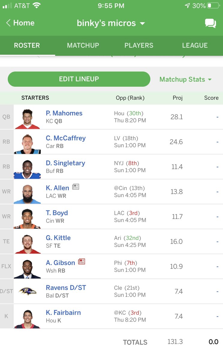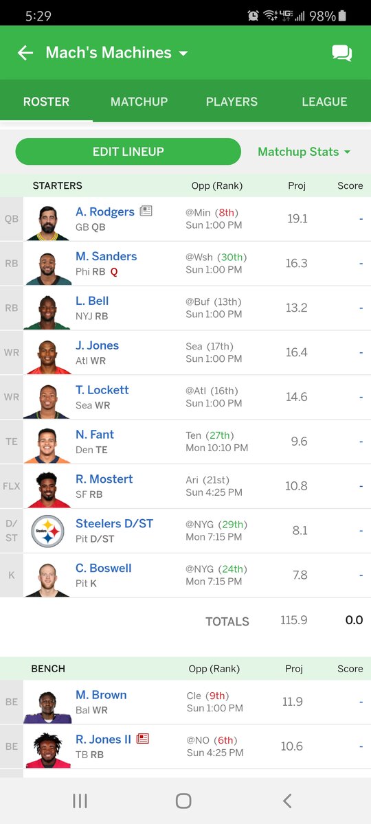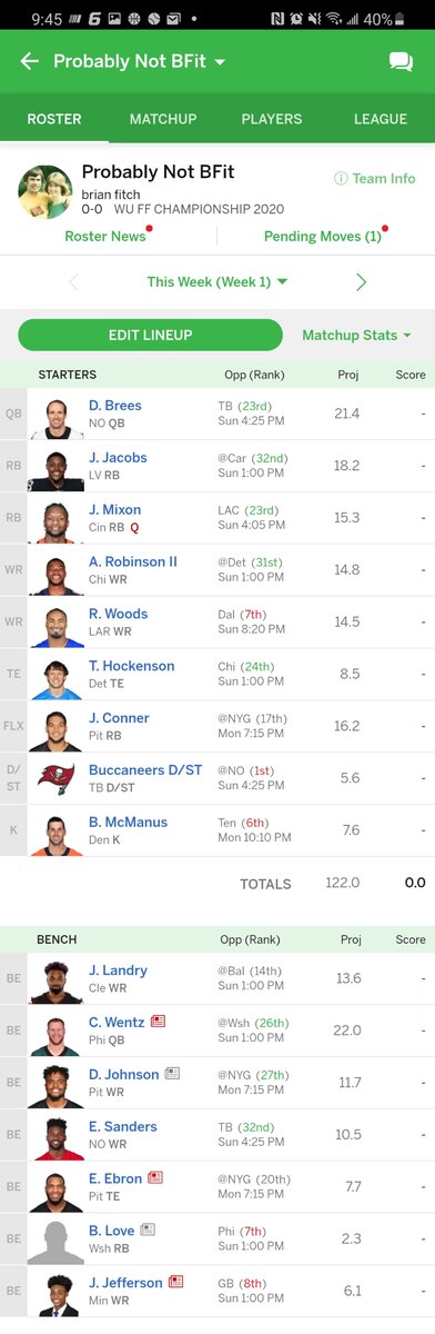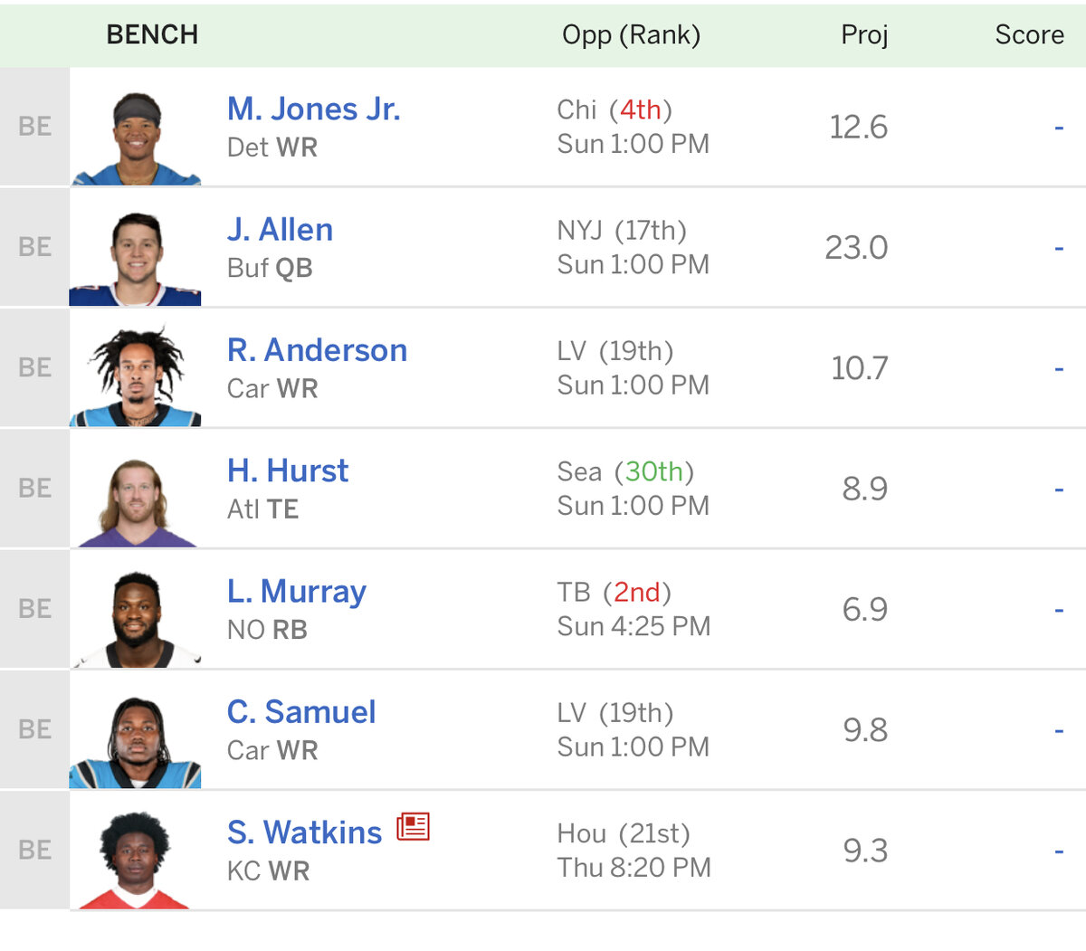 September 9, 20205 yr CHAMPIONSHIP! POS PLAYER BYE QB D. Watson 8 RB D. Johnson 8 RB C. Akers 9 WR M. Thomas 6 WR D. Hopkins 8 TE R. Gronkowski 13 FLEX D. Chark Jr. 7 D/ST Colts D/ST 7 K R. Gould 11 BE T. Cohen(RB) 11 BE D. Jackson(WR) 9 BE C. Kirk(WR) 8 BE D. Jones(QB) 11 BE A. Mattison(RB) 7 BE L. McCoy(RB) 13 BE B. Jarwin(TE) 10