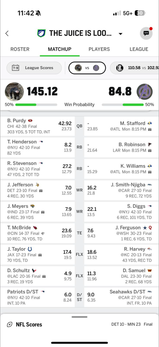 December 19, 2025Dec 19 46 minutes ago, BBE said:Speaking of going off...Puka!!!!On 12/16/2025 at 4:35 PM, paco said:I got knocked out of my money league. My core was Achane, Puca, JSN and McBride. I faded QBs in the draft (Love and Nix) but was able to pick up Burrow. Even my non core guys were above average. Watson and Jameson Wilson for WR3 and flex. Woody Marks as RB2. 40 point favorite going in.Nope. It was a total microcosm of my season. #1 in points scored but #2 in points against. I beat my projection by 27 points but didn’t matter. I couldn’t over come Goff , st brown and Henderson game especially with the egg burrow laid.If I play Nix, I win. If Woody marks gets back in the game, I win. Hell if Watson doesn’t get hurt, I win.Unbelievable.