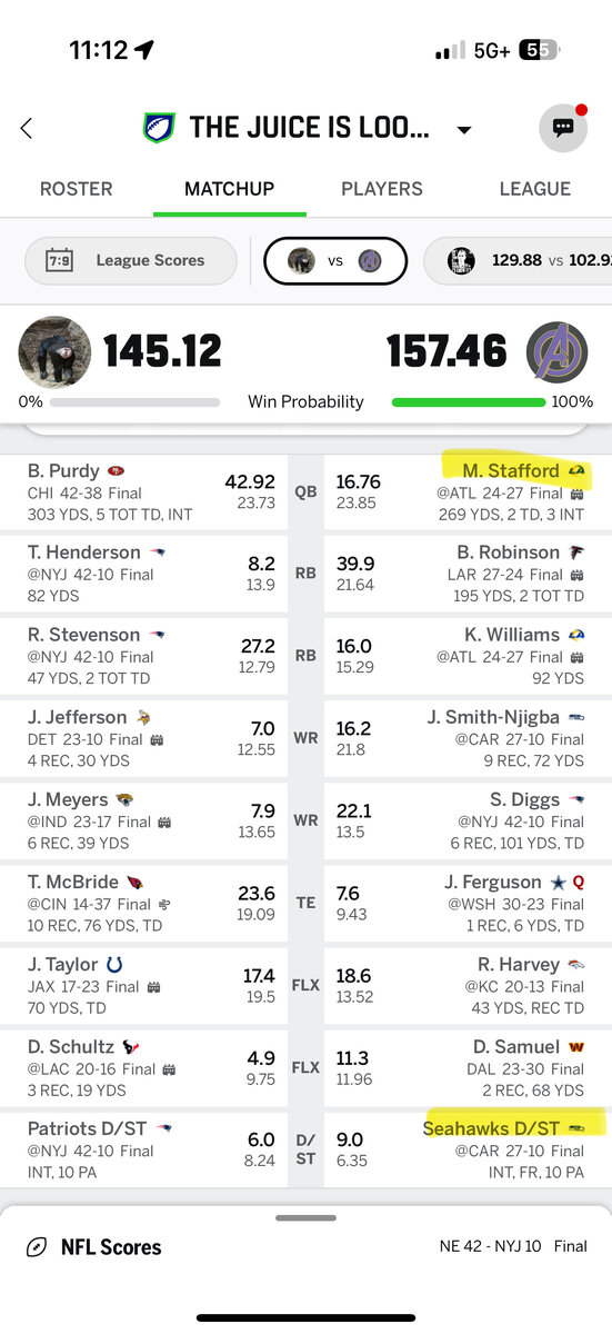 December 21, 2025Dec 21 On 12/19/2025 at 8:28 AM, Agent23 said:yeah F that dude (and I think I swapped out Stafford for Goff at like 3pm yesterday At least those aresholes lost!Same thing happened in my main money league. One guy had Puka. The other guy sat Stafford that afternoon. He’s rightfully been getting blasted by the entire league… as should you. 😂