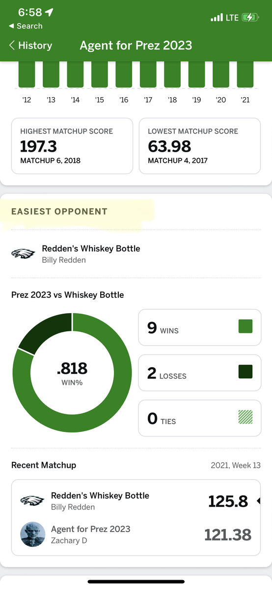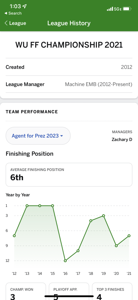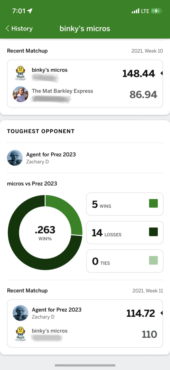 August 17, 20223 yr 1 minute ago, paco said: Had to take a dump so I thought i'd try out this history feature on the app. [Opens App] Oh this is cool, I can see my year by year finishes very easily on the bottom. [Scrolls through] Oh there is where I finished 2nd to hukd, oh the year before I went "undefeated", lets see next one, oh yeah, that year I didn't do so hot, what was the year before that like..... ....twister? Our lazy, good for nothing commish couldn't be bothered to remove twister and add me as new. He just edited my name and email address in his spot and called it a day. So now all my overall stats will be linked to the guy who wanted out and I replaced. Another point for @Machine Yeah my stats include all the years that the Indiana dude played