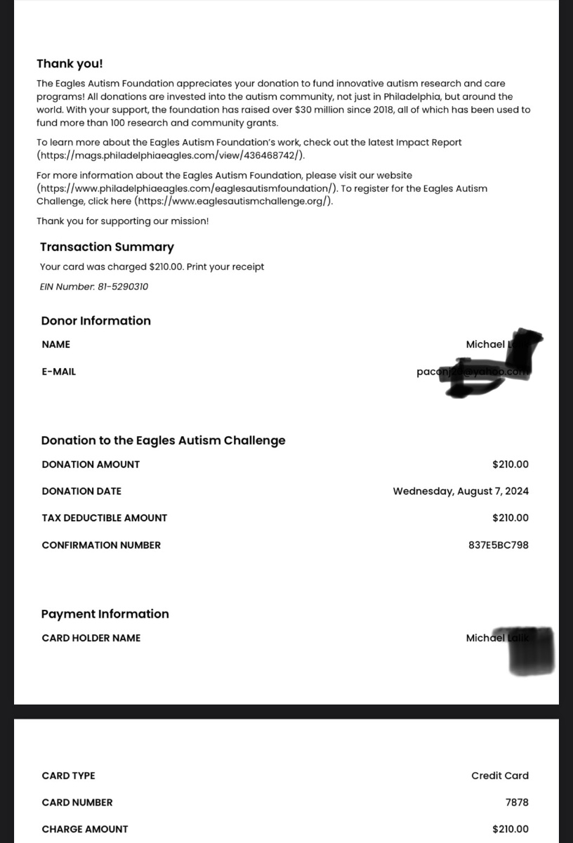 August 8, 20241 yr 22 hours ago, Mat said: Are we still doing the money/charity donation for the winner? 17 hours ago, binkybink77 said: Yes for anyone who wants to participate! Thank you for mentioning this because I kept forgetting to submit my win to it. We chose the Eagles Autism Foundation and we made the donation in Dawk20’s real name. Each year we just ask the winner of the league to choose an Eagles affiliated charity to donate the winnings to in @Dawkins 20 name. We chose EAF this year because we attended Kelce’s Sea Isle event that raises money for the foundation and a bunch of players signed my daughter’s doll. Dawk was a girl dad so I know he would have loved that story. Miss you Dawk! Current charity pot is up to $60