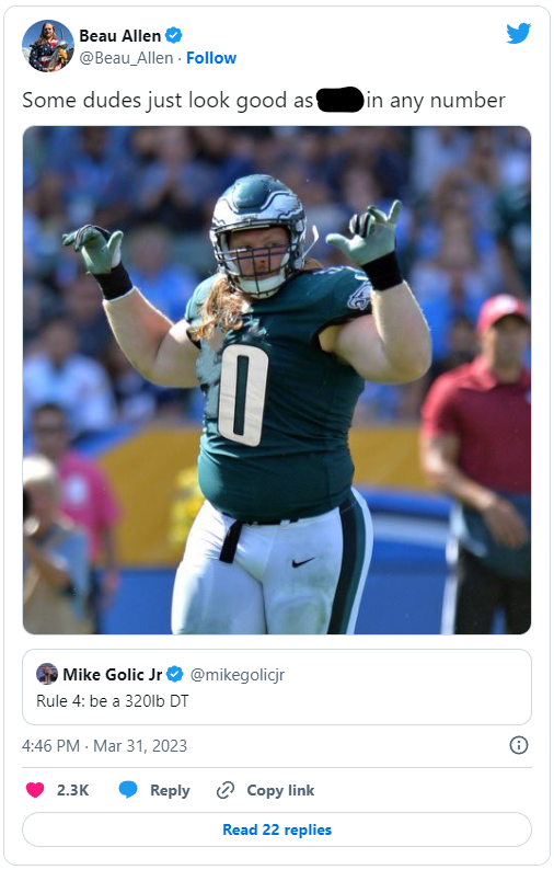 Posted April 10, 20232 yr Sunday Notebook Posted: April 9th, 2023 | Author: Tommy Lawlor There was a time when Nick Sirianni was a major question mark. The Eagles were the only team to interview him so his hiring led to a few questions. Then his first press conference didn’t go smoothly and there were even more questions. That was then, this is now. Sirianni has been a great coach and just led the Eagles to the Super Bowl. Patrick Daugherty does coach rankings every year and just put out his list. 8. Nick Sirianni, Eagles Career Record: 23-11 (.676) With The Eagles Since: 2021 Last Year’s Ranking: 15 Nick Sirianni has seen it all in two years. With a young coach that would usually mean something like "went 1-15 the first season, saw all three of his quarterbacks get injured the next.” For Sirianni it means he made the playoffs in Year 1 after changing his entire offensive approach on the fly. Year 2? He did it again, going from 32nd in pass attempts to 23rd while maintaining the league’s most lethal rushing attack. He took Jalen Hurts from project to dual-threat to MVP candidate. And, oh yeah, he reached the Super Bowl and lost by a field goal. Sirianni has sprouted the NFL’s hottest new coaching tree — both OC Shane Steichen and DC Jonathan Gannon cashed in their 2022s for head-coaching gigs — by being its most adaptable man. His 2022 offense finished first in rushing EPA and ninth in passing. Sirianni finished No. 1 in Football Outsiders’ "critical call index,” a complicated metric that measures fourth down decision-making. Trusting his personnel, Sirianni ordered the fourth most fourth down attempts and converted the second most. Sirianni "takes what the defense gives him” and then beats them over the head with it. Maybe next time they won’t call defensive holding. That might seem a little low, but the guys above Sirianni have all been with their teams since at least 2017 so they have more of an established track record. I think that’s reasonable. Interestingly, Andy Reid was number 2 and Doug Pederson was 10th. Jeff Lurie sure does know how to hire good coaches. Mike McCarthy was 21st on the list. This description is fantastic. Mike McCarthy is the first Cowboys coach since Jimmy Johnson to win 12-plus games in back-to-back seasons. He just notched the franchise’s third playoff victory since the 90s. How did he celebrate? By "moving on” from the coordinator who furnished him back-to-back top-five offenses, the second of which received five starts from Cooper Rush You see, the Cowboys weren’t running the ball enough in McCarthy’s opinion. He called their 19-12 Divisional Round loss to the 49ers a "shootout” before literally saying he didn’t want to be the No. 1 offense in the league. "I want to be the No. 1 team,” McCarthy elaborated. "And if we’ve got to give up some production and take care of the ball a little better to get that, then that’s what we’ll do because we have a really good defense.” McCarthy put an exclamation point on his retrograde thinking by making Brian Schottenheimer his new top offensive assistant. Kellen Moore did all he could to get the Cowboys at least middle of the pack in most advanced 2022 metrics. That is an area where McCarthy has made it clear he would rather be dead last. He wants to go back in time and take the Cowboys with him. He will succeed, with the likely result being the loss of his job. I hope that last sentence is very wrong. I want McCarthy to stay in Dallas as long as possible. Heck, could we do a Shining thing where he’s the coach forever? "You’ve always been the caretaker.” ***** Speaking of Sirianni, we know he loves competitive players and guys with a lot of juice. I read this write-up of CB Devon Witherspoon and couldn’t help but think he is a player Nick would love. In the Illinois team meeting room, the chattering ended and the meeting began with a booming "YERRRR!” It was Witherspoon — "Spoon” to teammates — getting things started. And getting things started is one of his specialties. "He was the energy in the team meeting room,” DeVito says. "His smile lights up the room, and then he’s probably one of the funniest dudes on the team.” Undersized cornerback, oversized personality. "He’s loud off the field,” Henry says. "He’s as confident as Deion Sanders was and talks as much trash as he did.” Witherspoon talks smack between every play. He talks smack before the game. He talks smack on the sideline. He talks smack in the locker room. He talks smack at practice. He probably talks smack in his sleep. His opponents need more than thick pads. They need thick skin. When Nebraska and Illinois played last October, Witherspoon matched up against Huskers wide receiver Trey Palmer, a burner who is expected to be a mid-round draft pick. When Palmer was being covered by Witherspoon, he was held without a catch. He might have had one on a deep route, but his quarterback missed the throw. When Palmer indicated his disappointment after the play, Witherspoon ran to him, made a crybaby gesture and asked if he needed his tears dried. His jabbering is an outgrowth of his competitiveness, which has been evident since PlayStation battles and card games with his older brother D.J. At Illinois, there were races, games of pencil fighting, conditioning challenges and heated competitions in pinball — they even kept a leaderboard. Witherspoon competed with the other corners on Henry’s game plan quizzes, which included unrelated riddles at the end. "The dude was about to fight in the room to decide who got the riddle right,” Henry says. That sounds like a guy Sirianni would love to coach and have on his team. Witherspoon is outstanding in coverage and can also do this. One of my favorite prospects in the draft. ***** This surprised me. The Eagles have the 7th most cap space in the league. They need some of that to deal with the draft class (especially two 1st round picks), but they