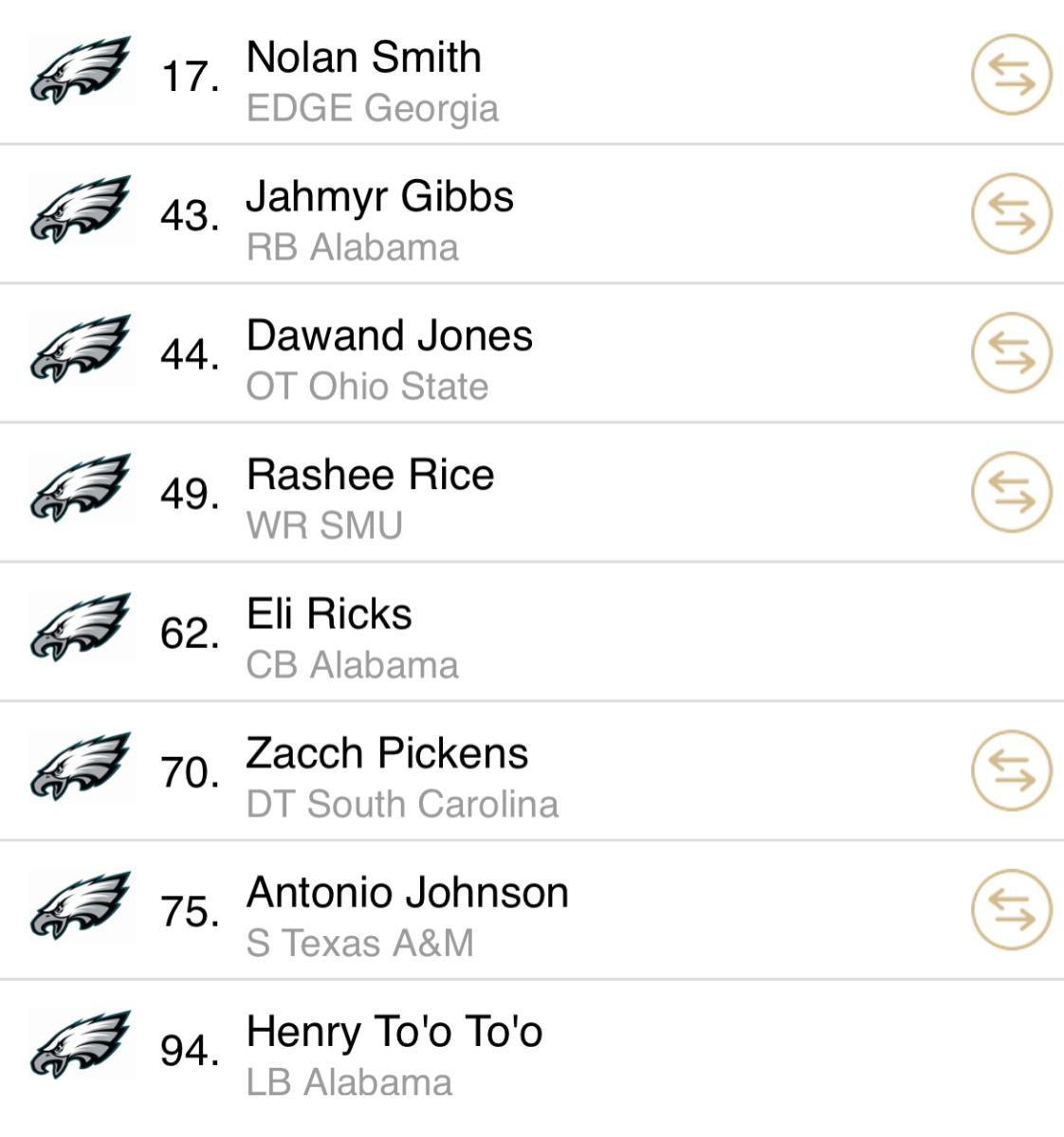 Posted April 22, 20232 yr After Jalen Carter was off the board, I decided to make moves with our 10th and 30th overall picks to accumulate three additional 2nd round picks while still maintaining a top 20 pick (couldn’t let Nolan fall past 17…) I think the context of each team’s trade offer to us makes a lot of sense looking at how the board was falling I.e. Jets moving up for a top LT, Steelers moving up for the top WR, etc. I feel like I plucked quality talent at EVERY need that truly FIT our schemes to the T… Added a lot of offensive firepower in Gibbs and Rice (aka our new stud slot WR), along with plenty of defensive talent to begin developing as replacements for the next wave of vets leaving in 2024. Best part? Dallas whiffed on Bijan, WR, and OL… TRADES