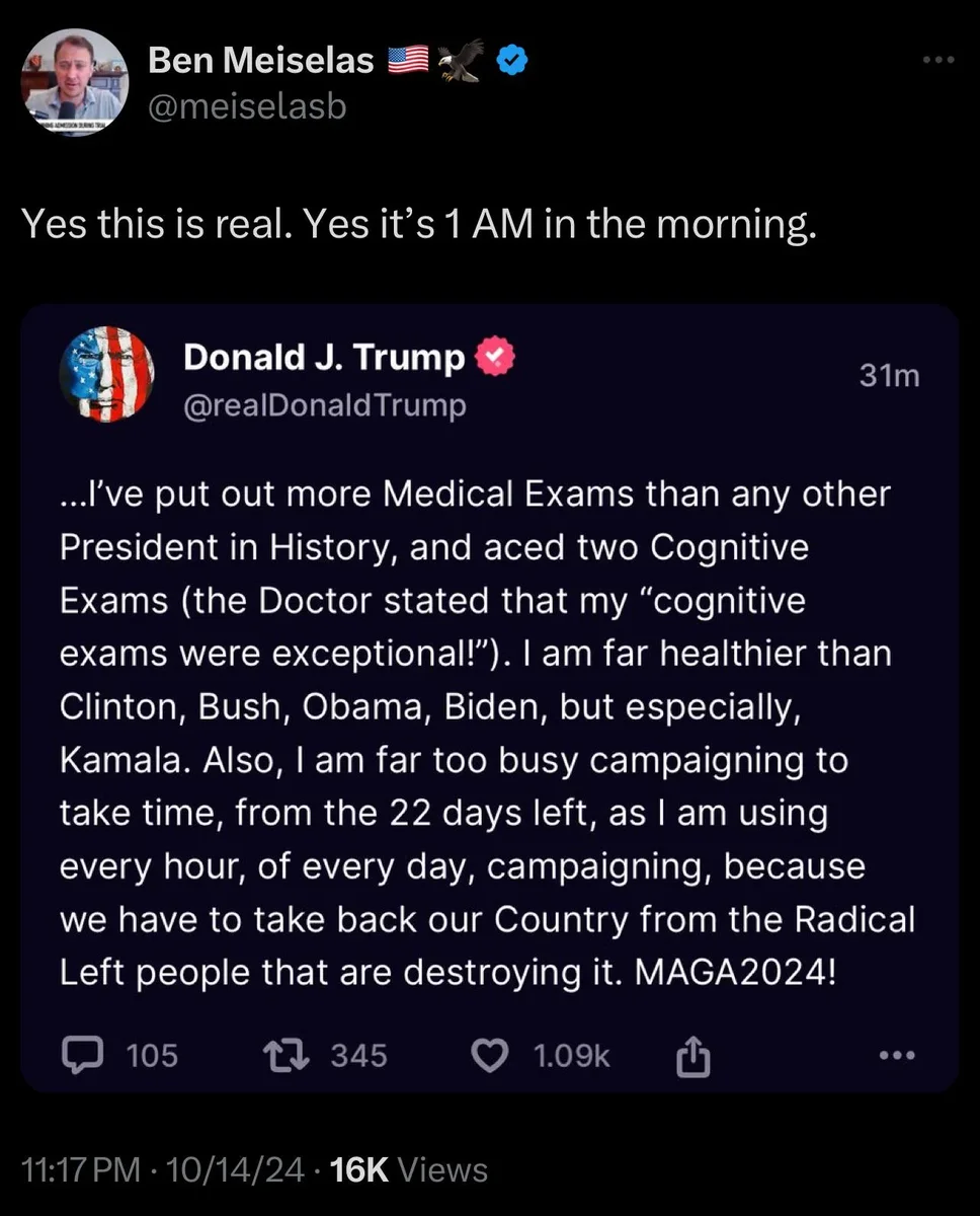 October 15, 20241 yr Just now, Tweek said: Fine, if he's healthier than Kamala, let's settle this with a race The guy doesn't sleep and has been going for months.