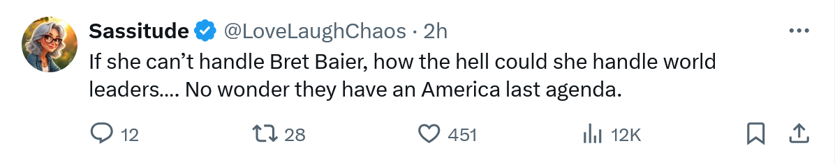 October 17, 20241 yr 27 minutes ago, Procus said: Translation - she's tanking in the polls, so she has to go on the interview circuit. But she can't hold her own in an interview. Word on the street is her internal polling is awful.