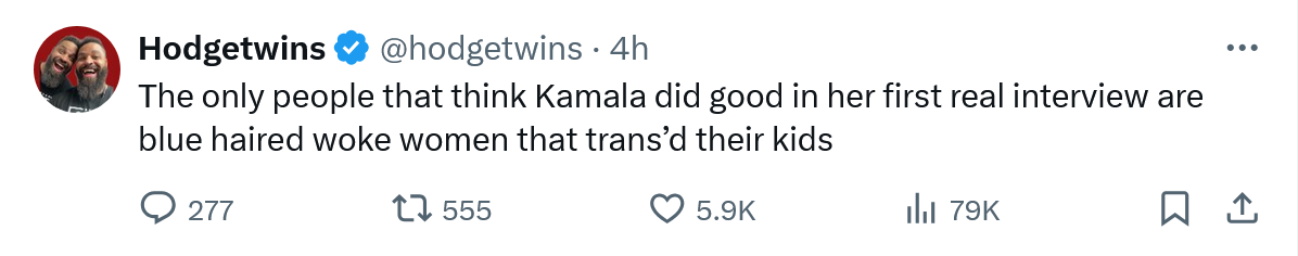 October 17, 20241 yr Ok be honest, how many of you actually watched the whole interview and how many of you are basing your impressions off of your twitter algorithm feeding you personalized 30 second clips?