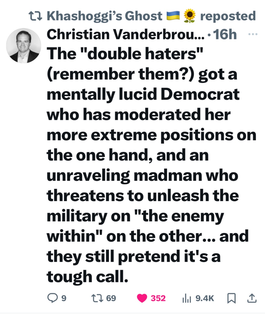 October 17, 20241 yr 2 hours ago, DEagle7 said: Ok be honest, how many of you actually watched the whole interview and how many of you are basing your impressions off of your twitter algorithm feeding you personalized 30 second clips? I'm watching it right now. Shipping her back California in a few weeks. Brett: Are they misguided, the 50%. Are they stupid? Harris: Oh God I would never say that about the American people..... There will be a commercial produced in 24 hours with her doing just that.