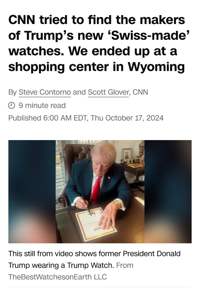 October 17, 20241 yr CNN tried to find the makers of Trump’s new ‘Swiss-made’ watches. We ended up at a shopping center in Wyoming But a CNN investigation into the manufacturing and distribution of the Trump-branded timepieces dead-ended at an innocuous-lookingshopping centerin a small city in remote northern Wyoming, not far from the border of Montana. There, sharing a parking lot with a hodgepodge of businesses including an H&R Block, a Wendy’s fast-food restaurant and a "vape and hemp smoke shop,”is a nondescript office space that serves as the mailing address for TheBestWatchesOnEarth LLC, the company behind the new line of Trump watches. The building houses a daycare, but there is no sign of the watches Trump says, "puts you in a very exclusive club.” Little is known or discoverable about the company now working with the Republican nominee for president, including the person or persons behind it. The lack of public details about Trump’s new business partner are a feature of where and how the limited liability corporation was created. And like other ventures Trump has launched while running for president, these watches are the result of an opaque arrangement prompting questions his campaign hasn’t answered and which couldn’t be resolved even by knocking on the door of the business’ listed address. CNN found dozens of other companies that claim the address as their own, too, including a separate limited liability corporation selling Trump-themed sneakers through a licensing agreement with the former president. Some are as far flung as a Washington, DC, lobbying firm that represents the government of Montenegro, while others have left little trace of their whereabouts.