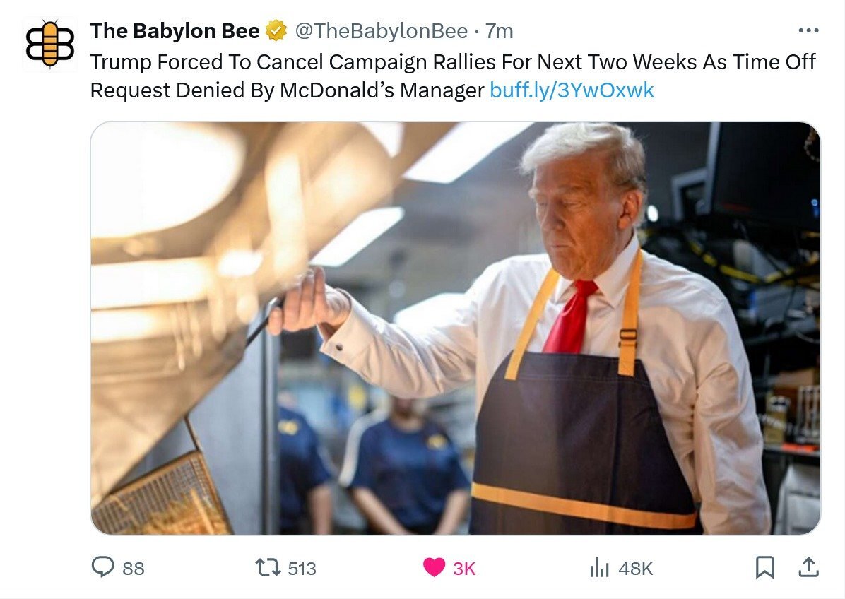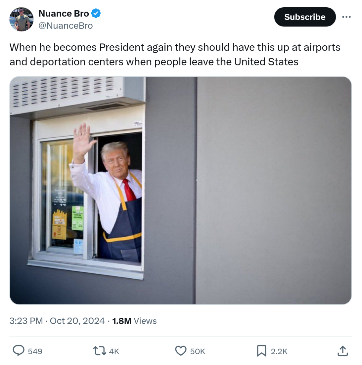 October 21, 20241 yr Serious question, do you idiots really believe the McDonalds stunt swayed any undecided voters? Like the thought "ya know I wasn't sure but then I saw him give out fries to a paid actor and Catturd said it was brilliant so now I'm gonna vote for him" is a genuine thought that entered another human beings head.