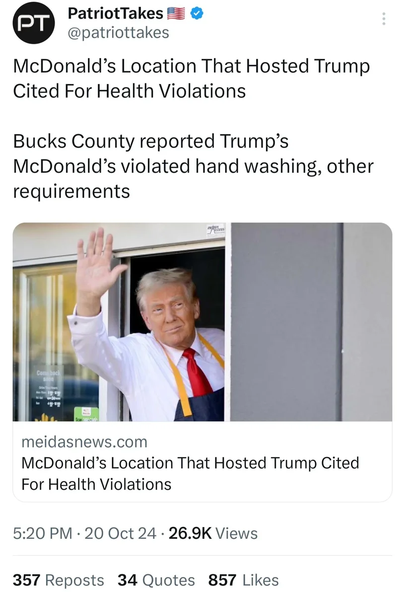 October 21, 20241 yr Lols - this McDonald's has been cited for health regs and the owner has complained about having to pay his employees more.. https://meidasnews.com/news/mcdonalds-location-that-hosted-trump-cited-for-health-violations