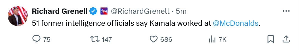 October 21, 20241 yr 44 minutes ago, Paul852 said: We are quite literally 2 weeks away from what could be the closest election ever and the topic of conversation is McDonald's work history. Wild. Kamala should work a shift at McDowell's