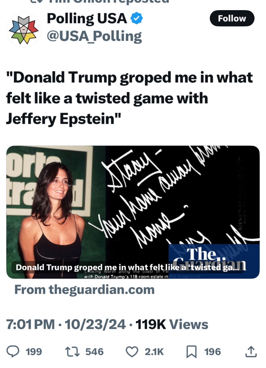 October 24, 20241 yr So to keep score today of the crap being thrown against the wall He is supposedly Hitler He supposedly groped kids He supposedly groped a model Spice cake reviving all the memories two weeks before an election. It's a miracle!